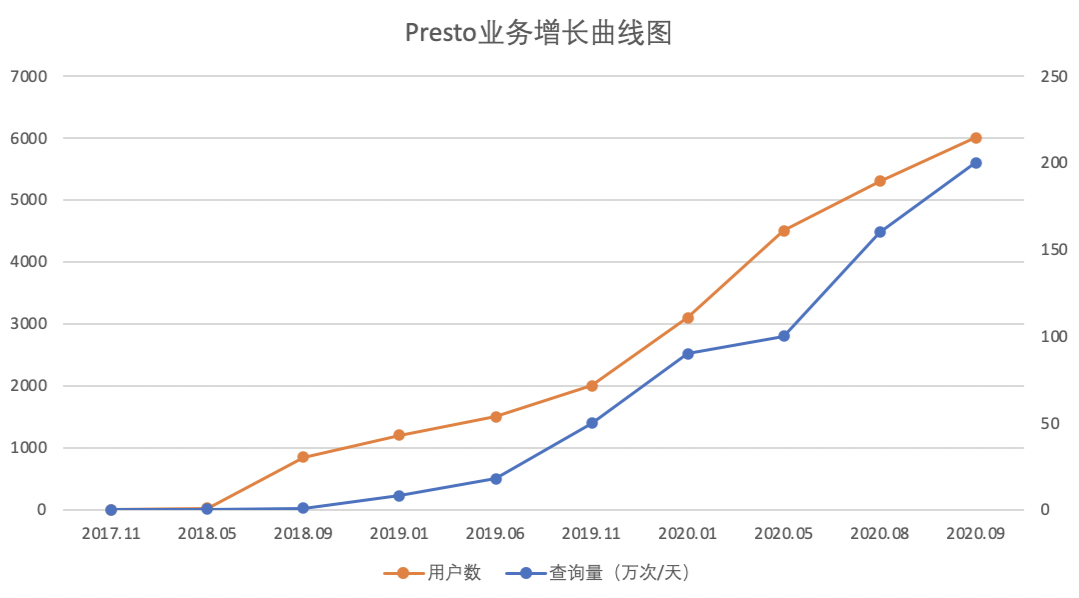 上图可以看到大约2018年10月该平台开始接入Presto,查询耗时TP50性能提升了10+倍,由400S降低到31S。且在任务数逐渐增长的情况下,查询耗时保证稳定不变。