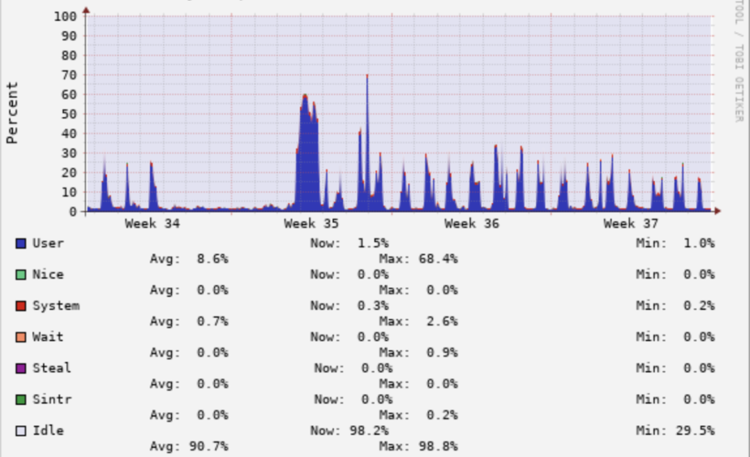 但是如果看最近一个月的CPU使用率会发现,平均CPU使用率比较低,且波峰在白天10~18点,晚上基本上没有查询,CPU使用率不到5%。如下图所示: