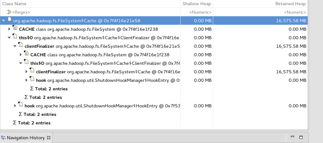根据职责划分,Presto分为Coordinator和Worker模块,Coordinator主要负责SQL解析、生成查询计划、Split调度及查询状态管理等,所以当Coordinator遇到OOM或者Coredump时,获取元信息及生成Splits是重点怀疑的地方。而内存问题,推荐使用MAT分析具体原因。如下图是通过MAT分析,得出开启了FileSystem Cache,内存泄漏导致OOM。