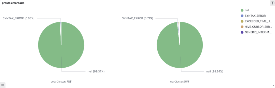 Hive SQL兼容,我们迭代了三个大版本,目前线上SQL通过率97~99%。而业务从Spark/Hive迁移到Presto后,查询性能平均提升30%~50%,甚至一些场景提升10倍,Ad-Hoc场景共节省80%机器资源。下图是线上Presto集群的SQL查询通过率及失败原因占比,'null' 表示查询成功的SQL,其他表示错误原因:
