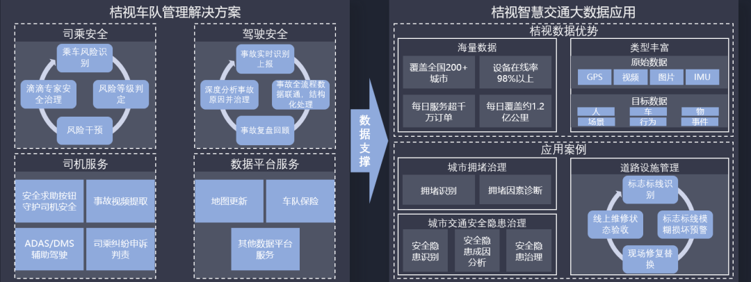 在满足网约车场景需求同时,桔视秉持“构建行车数据生态,让出行更智能”的理念,以滴滴出行的数据积淀和全场景闭环基础为引擎,深度驱动车联网行业创新释能,打造了一套完备的行业级硬件体系、高水平的软件服务体系和精准的AI算法能力,提供乘用车辆安全事故预防、货运车队管理、车险定价、地图更新、智慧城市等多领域的解决方案,共同构建桔视车队管理解决方案和桔视智慧交通大数据应用: