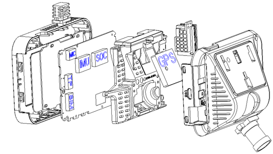 主机部分主要包括:SOC、Cam1、Sim卡、TF存储卡、GPS、IMU、Mic/Speaker等: