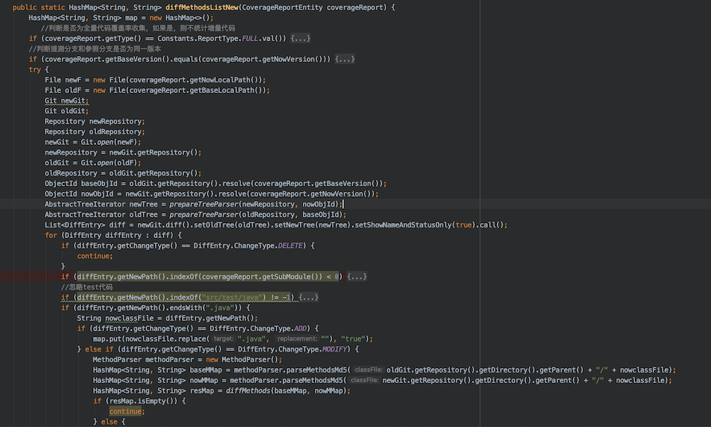 主要流程:拉取master(参照分支)和feature(提测分支)代码,再通过JGit对两个分支源码进行比对,获取增量代码。以下为部分代码片段: