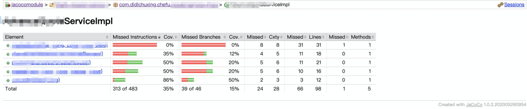 覆盖率报告如下图,在图中是某个 service 的实现类,在最新的代码中有23个方法,但是只会对变更或新增的5个方法进行覆盖率统计与显示: