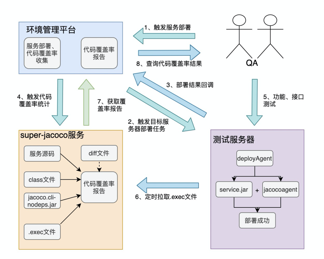 和环境部署平台ebase集成,只需要在JAVA启动命令中添加-javaagent:jacocoagent.jar=includes=com.*即可收集功能测试覆盖率数据;