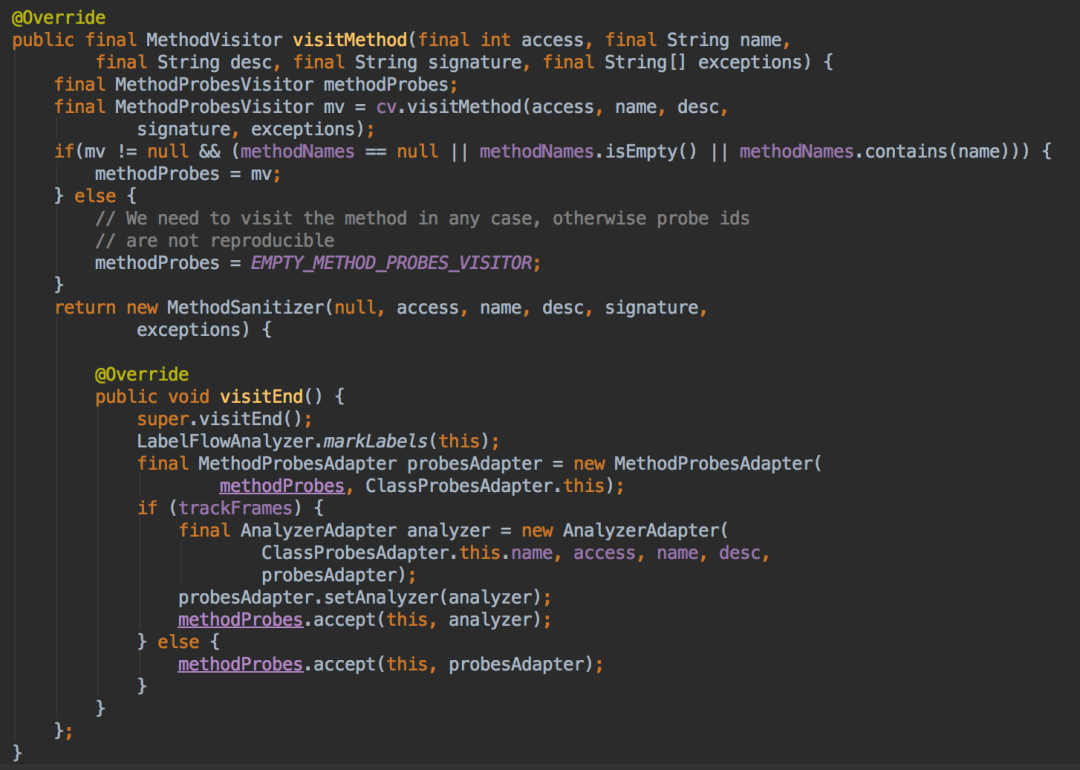 JaCoCo 对 exec 的解析主要是在 Analyzer 类的 analyzeClass(final byte[] source) 方法。这里面会调用 createAnalyzingVisitor 方法,生成一个用于解析的 ASM 类访问器,继续跟代码,发现对方法级别的探针计算逻辑是在 ClassProbesAdapter 类的 visitMethod 方法里面。所以我们只需要改造 visitMethod 方法,使它只对提取出的每个类的新增或变更方法做解析,非指定类和方法不做处理。改造后的核心代码片段如下: