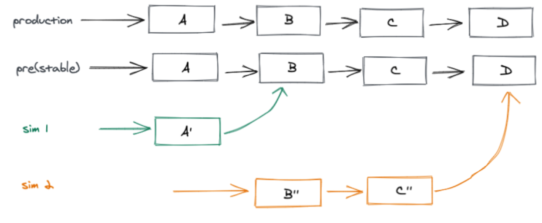 针对流量变化的测试,我们的关注点又回到了环境搭建上,All in one的模式肯定是不可持续了,那如何才能以低成本方式保证每人都有一套稳定的、高仿真度的测试环境呢?我们发现预发环境(类线上环境,除了没有真实流量之外,其他跟线上环境无异)承担了很多自动化测试工作,并且足够稳定和仿真,所以我们又开始了通过预发环境做测试的环境的探索,也就是业界常说的TiP(Test in Production),先别着急喷TiP的各种问题,后面会说。其实从整个环境问题来说,最难的其实就是下游依赖,如果我们把下游的预发环境做为测试环境的依赖,上游只需要部署被测服务即可,然后通过逻辑隔离的方式(测试账号)实现人手一套环境,成本也足够低。按照这个思路,我们在18年开始了TiP-Sim环境(线上仿真环境)的建设,设计方案如下。