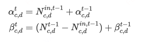 基于此,在可接受的精度损失范围下,我们假设同一类别内的样本具有同质性,因此可以利用第t−1时刻内在每个类别内观测到的我方RSP的被默勾数(服从二项分布),在第t时刻执行贝叶斯后验更新。对每个类别c和折扣券d∈d,记其最新Beta分布参数为 和 。