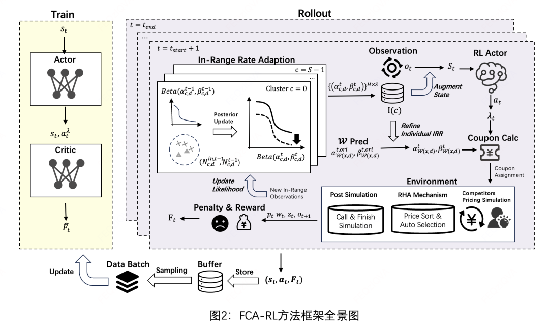 为填补这一空白,我们提出了一种名为FCA-RL的创新型投资优化框架,旨在帮助服务商更高效、更负责任地运用投资资源参与竞争。该方法设计了一种快速竞争适应(FCA) 的机制,使其能敏捷响应动态变化的市场格局(如竞争对手的投资策略调整行为)。同时结合基于强化学习的拉格朗日乘子调整(RLA) 技术,确保在优化决策时严格遵循预算约束,提高每笔投资资金的有效利用率(钱效),最终服务于在有限投入下为乘客争取更佳的综合体验(包括合理价格与可接受的服务可得性)。