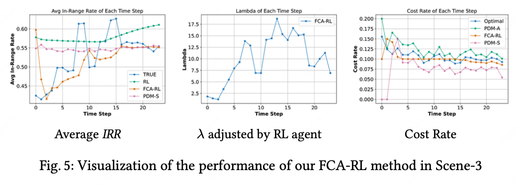 FCA-RL方法通过实时调整拉格朗日乘子(λ)来动态响应市场变化。如图4所示,在其他RSP投资幅度变化引发的IRR分布漂移中,本方法相较依赖训练集分布做静态规划求解的基准方案(PDM-S)展现出更敏捷的适应能力(窗口尺寸为1时,FCA对IRR变化敏感性增强,但会导致RL训练波动加剧)。图5进一步揭示:RL智能体依据IRR分布变化逐步调整λ参数(前两列),第三列对比显示FCA-RL通过实时优化λ,实现相较基线方法有更平滑的预算执行轨迹,并且更严格地控制了预算执行。