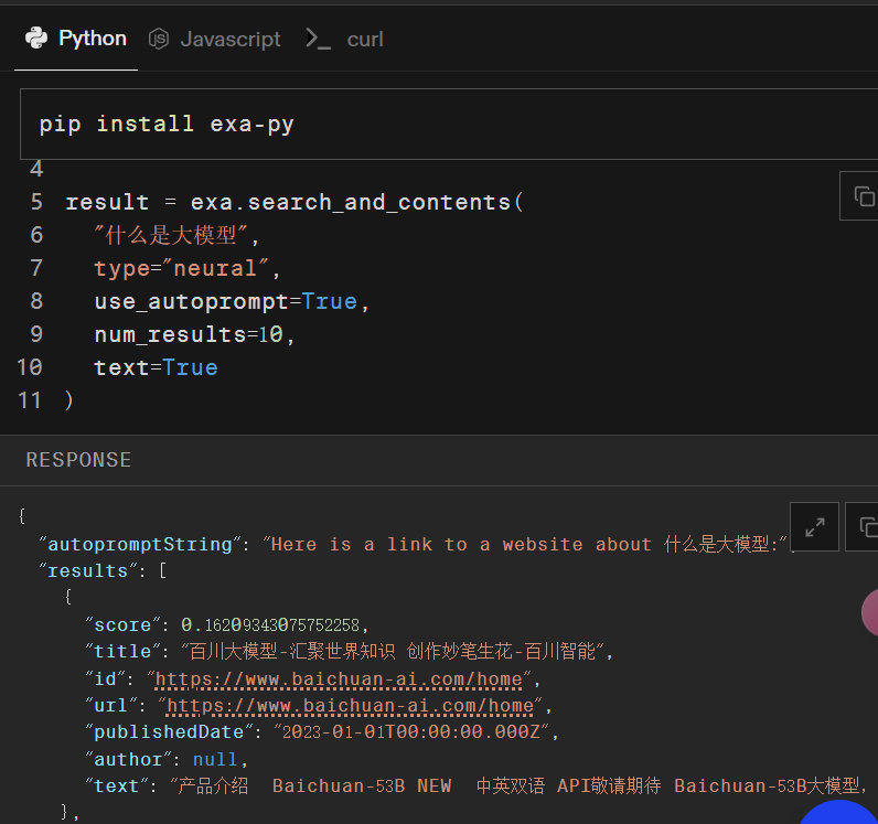 适合大模型的检索引擎也是一个技术方向,自从大模型火了之后有了一些专门做这方面的初创公司。例如,Tavily,一个用的比较多的大模型搜索引擎,不过每人每月只有1000次搜索,我们这次就不用了,我们用Exa,因为没有限制