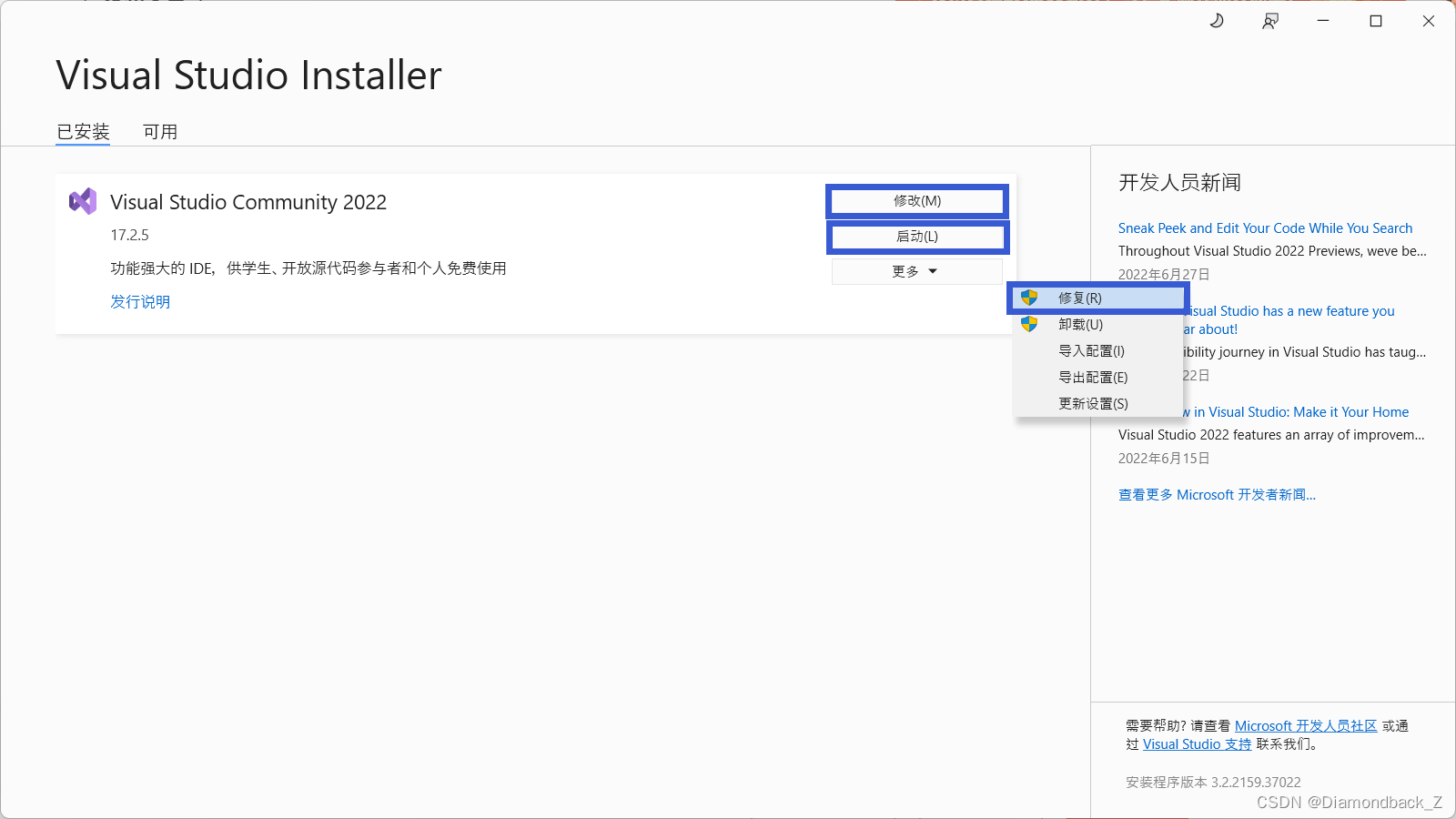 进入后界面中修改即可,修复即重装 VS 2022