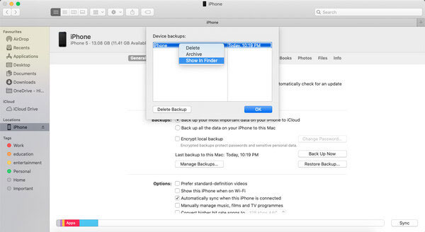 - 选择“在 Finder 中显示”,查看 Mac 上的 iPad/iPhone 备份。