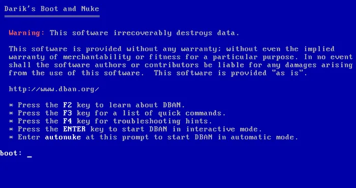 DBAN 加载完成后,您将看到一个基于文本的界面。您可以使用 autonuke 命令进行快速自动擦除,也可以手动选择特定驱动器并选择更高级的擦除方法。