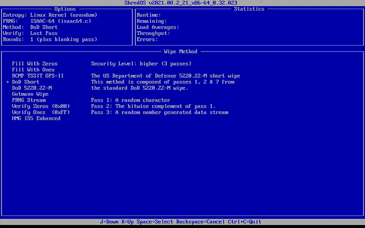 ShredOS 提供多种数据清理方法,从快速的单次传递到更严格的多次传递选项。
