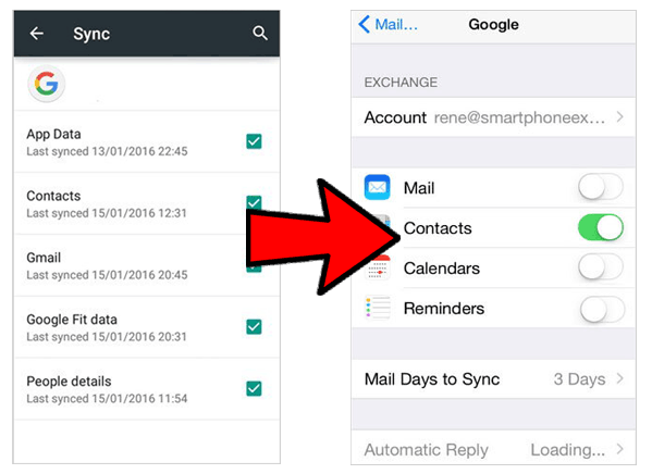 - 启用“联系人”和其他你希望传输的数据的同步功能。