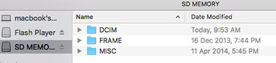 - 在 Finder 中找到 SD 卡,拖拽文件到目标文件夹。