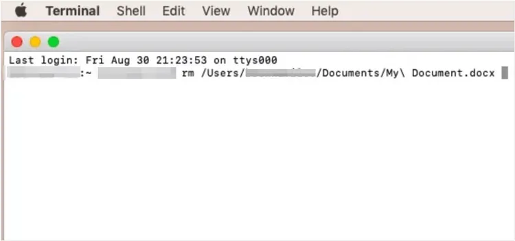 输入rm -f (注意 -f 后面的空格)。然后,将要删除的文件拖放到终端窗口中。这会自动插入文件路径。完整的命令如下所示: rm -f /path/to/the/file/File Name.ext 。
