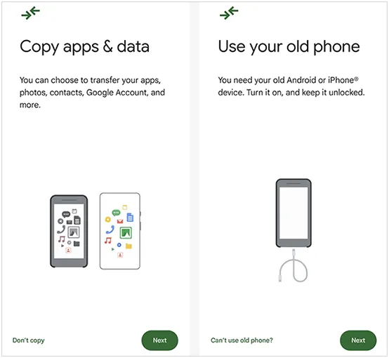 开始在您的新安卓手机上进行设置。请将您的安卓手机连接到移动网络或Wi-Fi网络。当提示“复制应用和数据”时,请多次选择“下一步”。