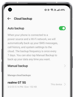 注意: 如果备份失败,请检查设备存储空间、网络连接、系统版本,或联系 realme 客服获取帮助。