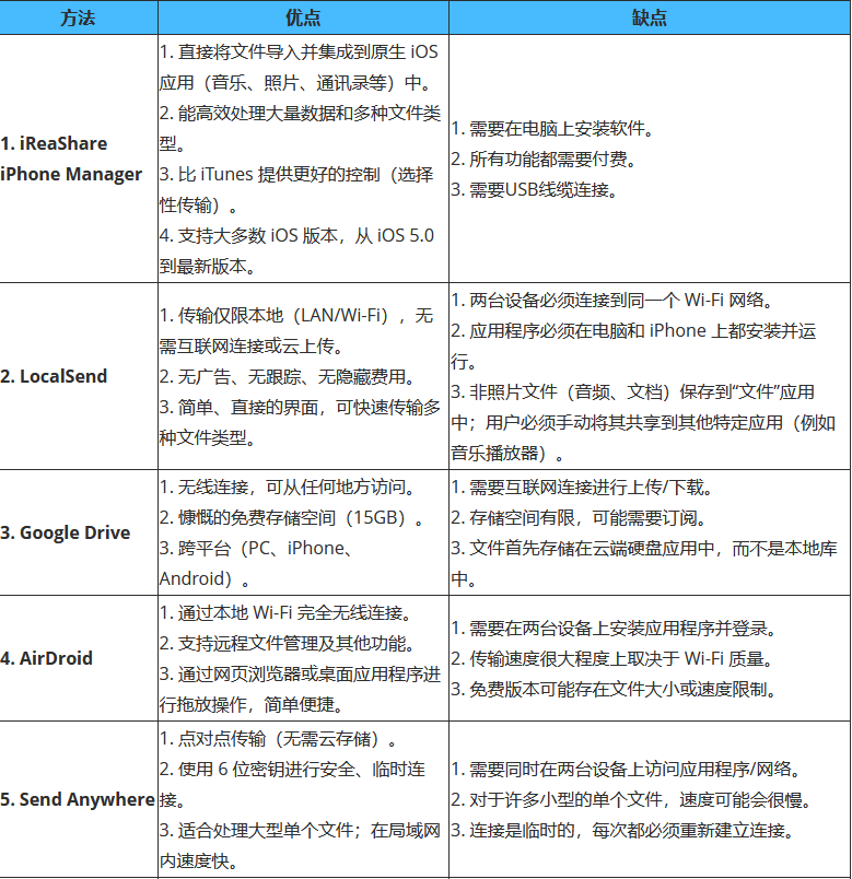 如果您更喜欢像iReaShare iPhone Manager这样功能强大的专业应用程序,您可以下载它,然后轻松地在电脑和 iPhone 之间传输文件。这款工具将为您提供更多实用功能。如果您喜欢 Google Drive 和 iCloud 等云服务的便捷性,可以直接使用它们在设备之间同步文件。当然,您也可以选择其他无需 iTunes 的文件传输方式。