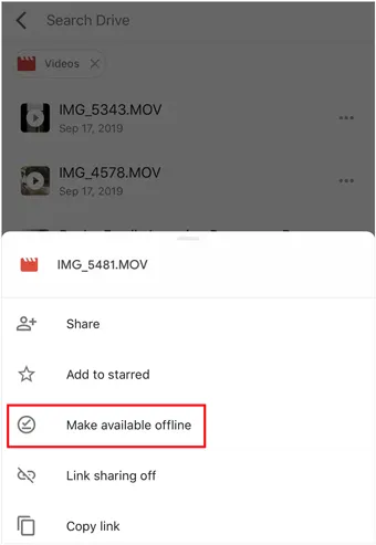然后您可以导航到已上传的文件。要将文件保存到您的 iPhone,请点击文件旁边的三点菜单,然后选择“可离线使用”>“保存到文件”。