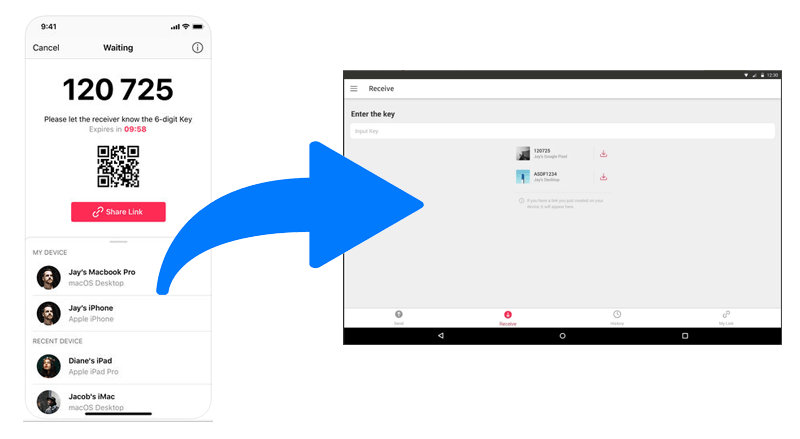 - 选择“接收”选项卡,输入6位密钥(或扫描二维码,如支持)。