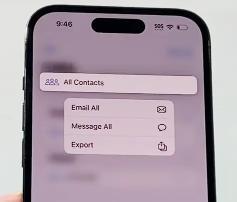 步骤 2:长按“所有联系人”列表,然后在弹出窗口中选择“向全部发送电子邮件”。或者您可以选择“导出”,先将所有联系人保存为 VCF 文件。
