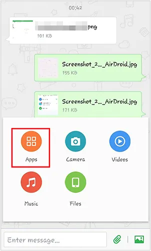 步骤 4:单击“回形针”图标,然后选择“应用程序”以选择您想要移动到新设备的应用程序。然后单击“发送”开始传输。一段时间后,您将在新的 Android 设备上收到这些应用程序。