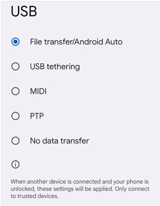 使用 USB 数据线将安卓手机连接到电脑。在手机上,下拉通知栏,将 USB 模式设置为“文件传输/Android Auto ”或“ MTP ”。