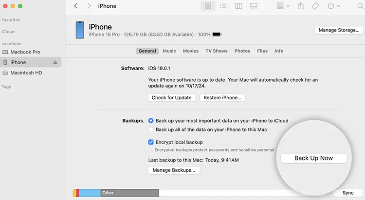 步骤 4:在主 Finder 窗口中的“常规”选项卡下,选择此选项。然后单击“立即备份”将您的 iPhone 联系人、消息、图片等备份到您的 Mac 电脑。