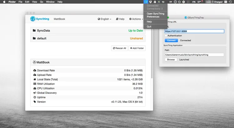 在 Mac 上打开 Syncthing,打开 Syncthing 网页界面,并在网页界面上完成大部分配置。接下来,在设置或操作菜单中找到您的设备 ID。