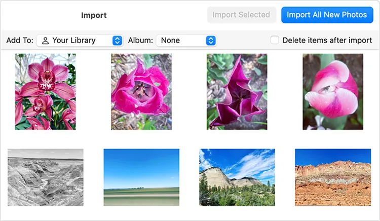 选择“导入所有新照片”或选中特定视频,然后点击“导入所选内容”。