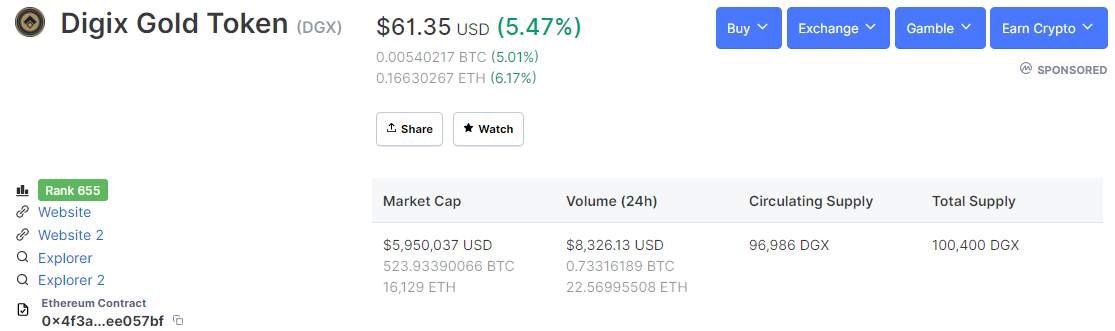 总部位于新加披,由DigixGlobal公司发布的黄金代币,1DGX=1克黄金,由加拿大皇家铸币厂和新加披SilverBullion等合作商提供实体黄金,DGX受新加披政府金融服务部批准及监督,属于Erc20代币,可在Uniswap等Defi交易所 / /官网获得,对应的实体黄金储存于新加披与加拿大专业金库。>DGX官网