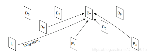 临时L0中首先按POC降序加入RPS RefPicSetStCurrBefore中当前图像的参考图像,这些都是POC小于当前图像的短期参考图像,上图中即P1、B2。然后按POC升序加入RPS RefPicSetStCurrAfter中当前图像的参考图像,这些都是POC大于当前图像的短期参考图像,上图中即B6、P5。最后加入长期参考图像I0。则B7临时L0为{P1,B2,B6,P5,I0}。