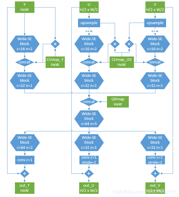 YUV三个分量分别通过wide-SE-blocks处理,每个与其对应的CUmap融合,融合方式是将CUmap逐像素与其对应通道相乘。由于U和V的尺寸只有Y的一半,所以需要上采用进行尺寸对齐。