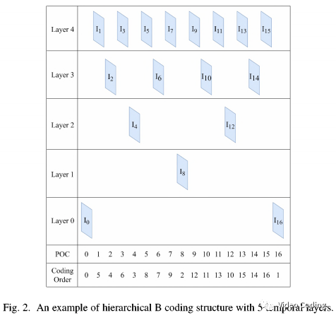 本算法利用HEVC在RA配置下的分层B帧结构,分层B帧结构有5个时域层,如下图所示。