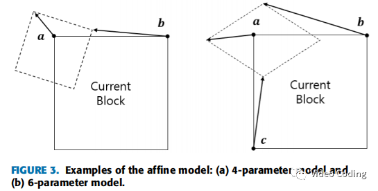 传统运动补偿(CME)只能处理平移类运动,AME能够处理旋转、缩放等运动。VTM提供了两种仿射模型:四参数模型(2个控制点)、六参数模型(3个控制点),如Fig.3所示。