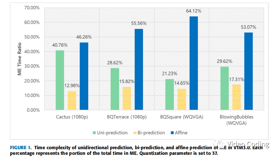 AME在整个运动补偿(ME)过程中占据大量时间。Fig.1展示了单向预测、双向预测和仿射预测分别的时间占比,其中AME占用平均54.75%的复杂度。因此,本文将探索AME的快速算法。