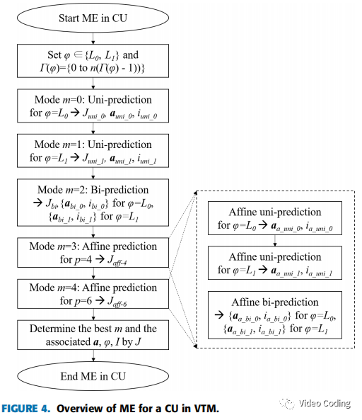 如Fig.4所示,CU的ME过程包括CME和AME。CME是传统的单向预测和双向预测,AME包括四参数AME和六参数AME,每种AME又包括单向和双向两种情况。CU在ME过程中按顺序遍历每种模式分别计算RD cost,最后选择RD cost最小的模式m,和对应的最优MV a,最佳参考帧索引i。