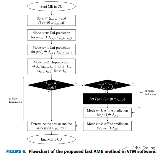 Fig.6是在VTM的CME基础上改进的流程图。可以看见,在第一阶段首先检查父CU(CU_par)的最优模式是否是skip模式,如果CU_par最优模式是skip则当前CU跳过AME,在这种情况下当前CU的最优模式要么是单向预测要么是双向预测。在第二阶段,CU_par最优模式不是skip,在根据RD cost计算当前CU在CME中的最优模式,如果最优模式是单向预测,则AME的L0中最大参考帧索引减小为CME的L0中的最佳参考帧索引,L1参考列表不变。