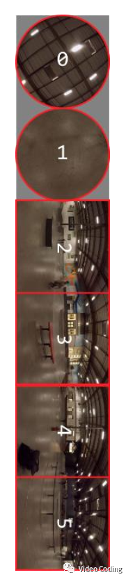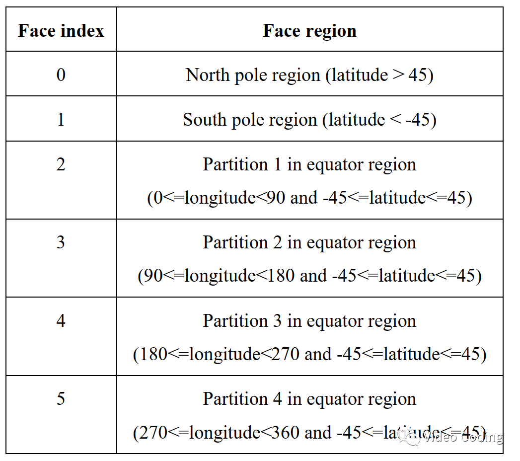 分段球面投影(Segmented sphere projection,SSP)将球面分为3个部分:北极、南极、赤道。图1是SSP投影示意图,球面上三个部分的分界线是北纬45度和南纬45度。北极和南极投影后的面是圆,索引分别为0和1,赤道投影方式和ERP相同,赤道投影后被划分为4个相同的正方形面,索引为2到5。投影后面的两极圆的直径和赤道正方形边长相等,因为它们纬度都跨了90度。