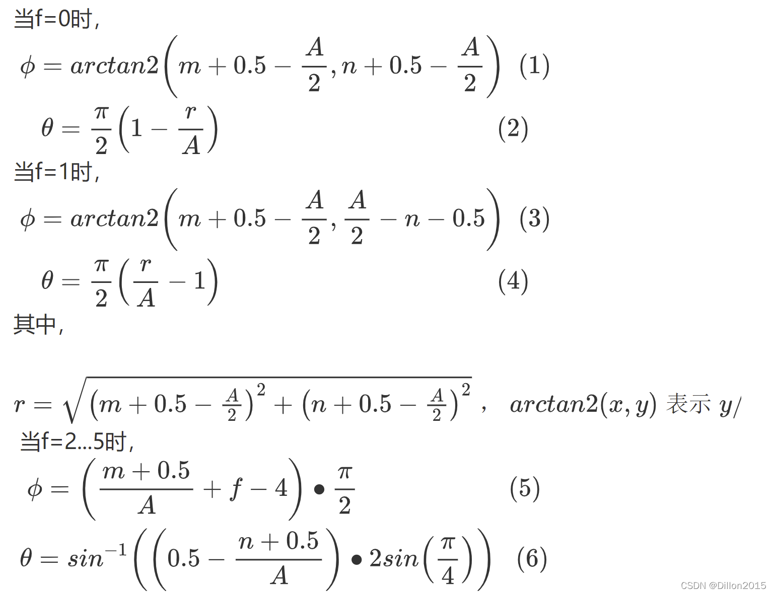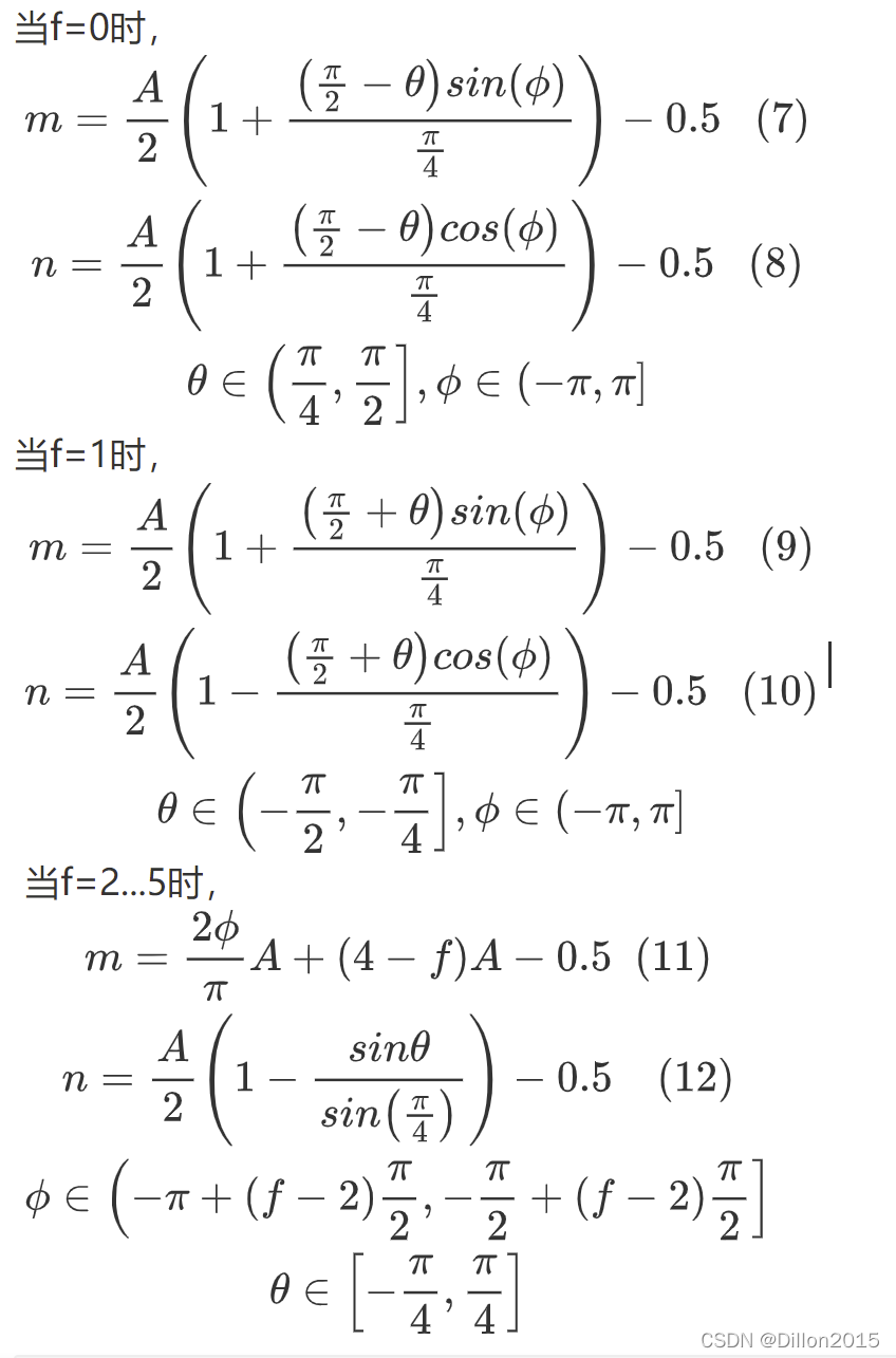2D-3D变换,假设面的直径是A,则2D平面上的点(m,n)按下面方式转换为球面上的,