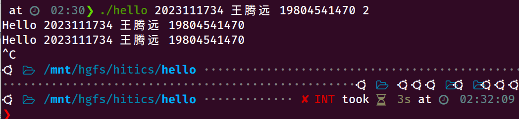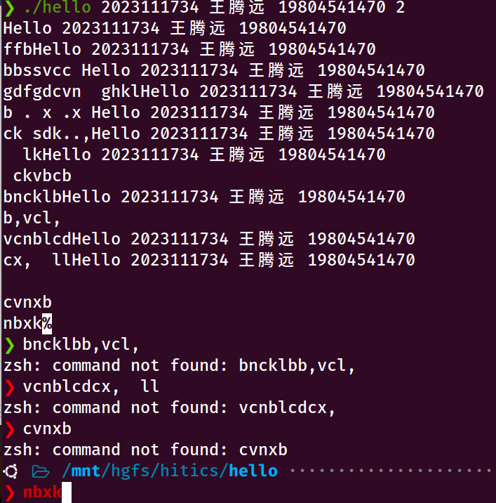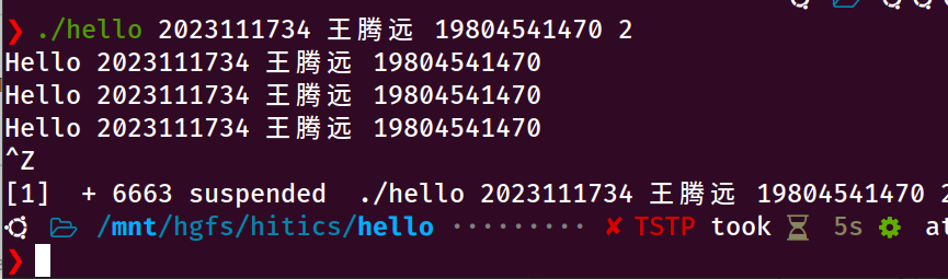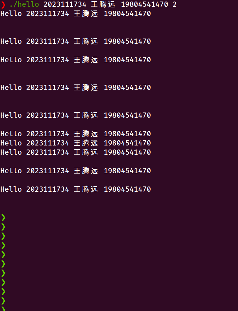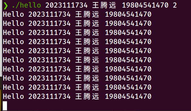 输入./hello 2023111734 王腾远 19804541470 2(电话号%5=0,不好操作,这里使用2)。