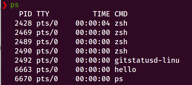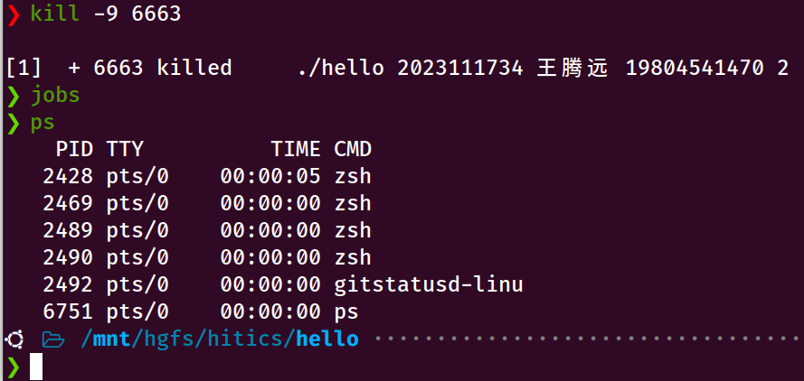 这时输入ps,可以看见PID为6663的进程是我们的hello。再输入jobs查看被挂起的进程,可以看见hello被暂停,而并未被结束。