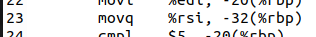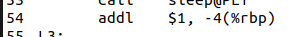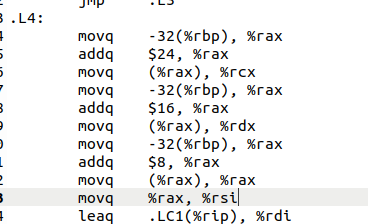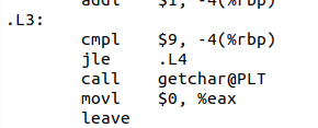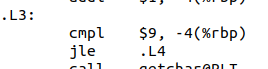 先将i和9进行比较,jle是不相等则执行,即如果不相等,就会跳转到L4,执行循环内容,循环末尾addl $1, -4(%rbp)实现i++,实现循环计数。
