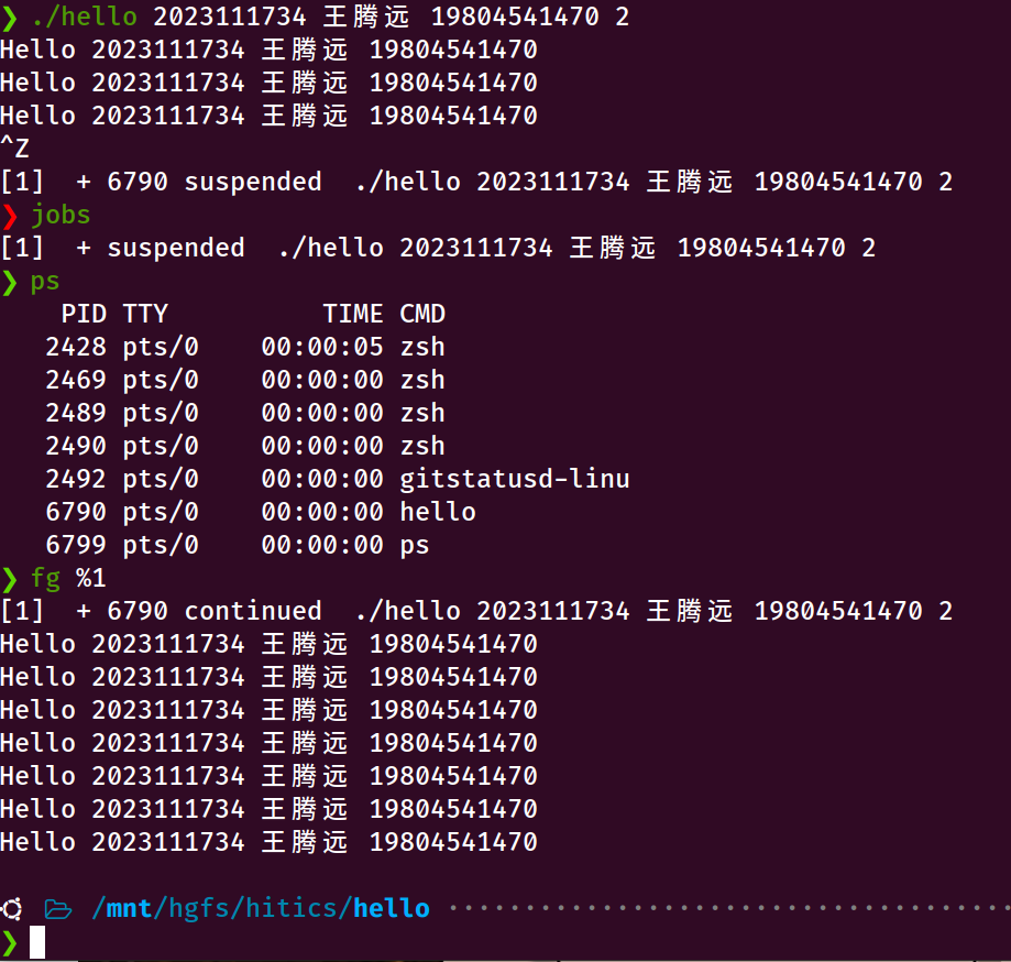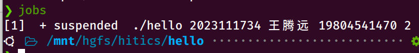 输入fg %对应的工作号,可以将被挂起的进程恢复到前台继续执行,hello从被挂起处继续运行,打印剩下的语句,程序正常结束。
