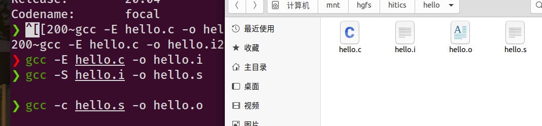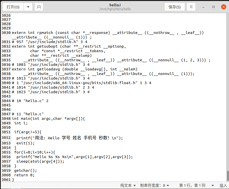 预处理后生成了hello.i文件,文件共有3061行,内容比起.c文件大大增加。可以看到主函数中的内容在最后的部分。之前的部分则是stdio.h unistd.h stdlib.h头文件的引入和替换以及对#define内容的替换。首先先找到头文件对应的位置,将其引入,然后删除对应的#include语句,对#define内容也进行相应替换,进行预处理。