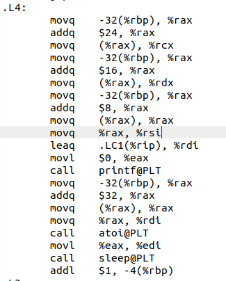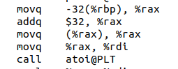 首先从栈中取出 argv的初始地址,保存到 %rax 中。因为每个指针8个字节,因此移动32个字节到达argv[4]的地址,再将此地址传给rdi,然后调用atoi函数进行类型转换。