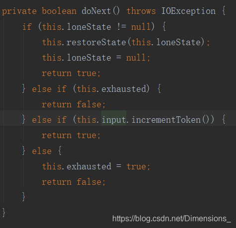 之后用返回的filter对象调用incrementToken方法,外层装饰对象先调用内层装饰对象的incrementToken方法,执行顺序为:最先进行分词,再按照装饰顺序进行过滤,最终分词结果转为指定词元格式后返回。